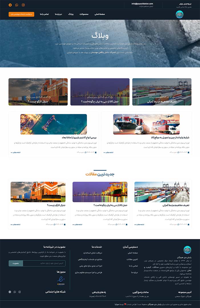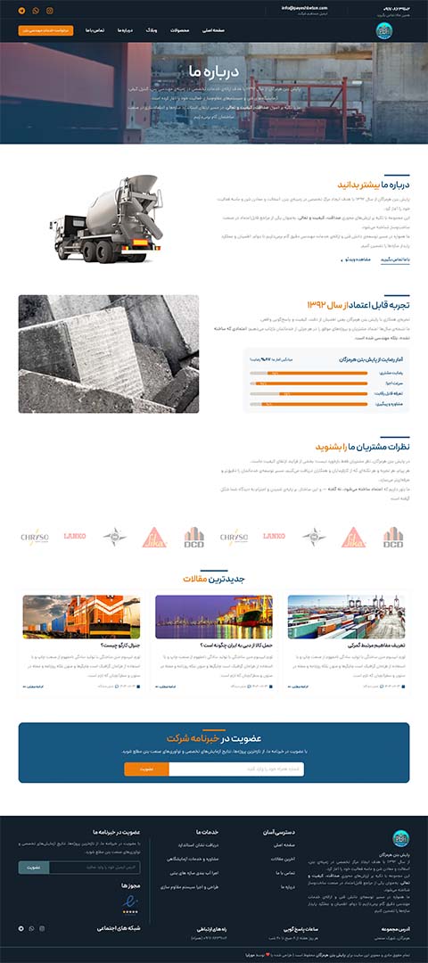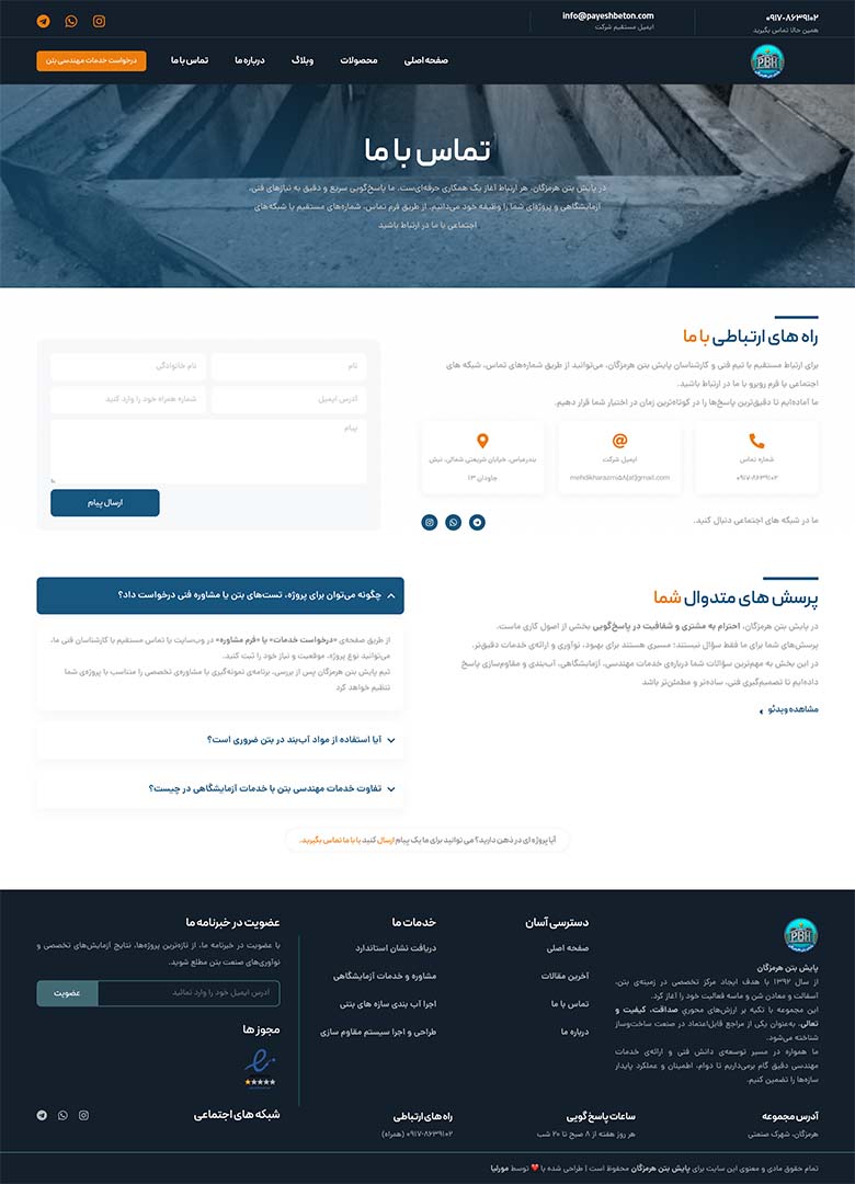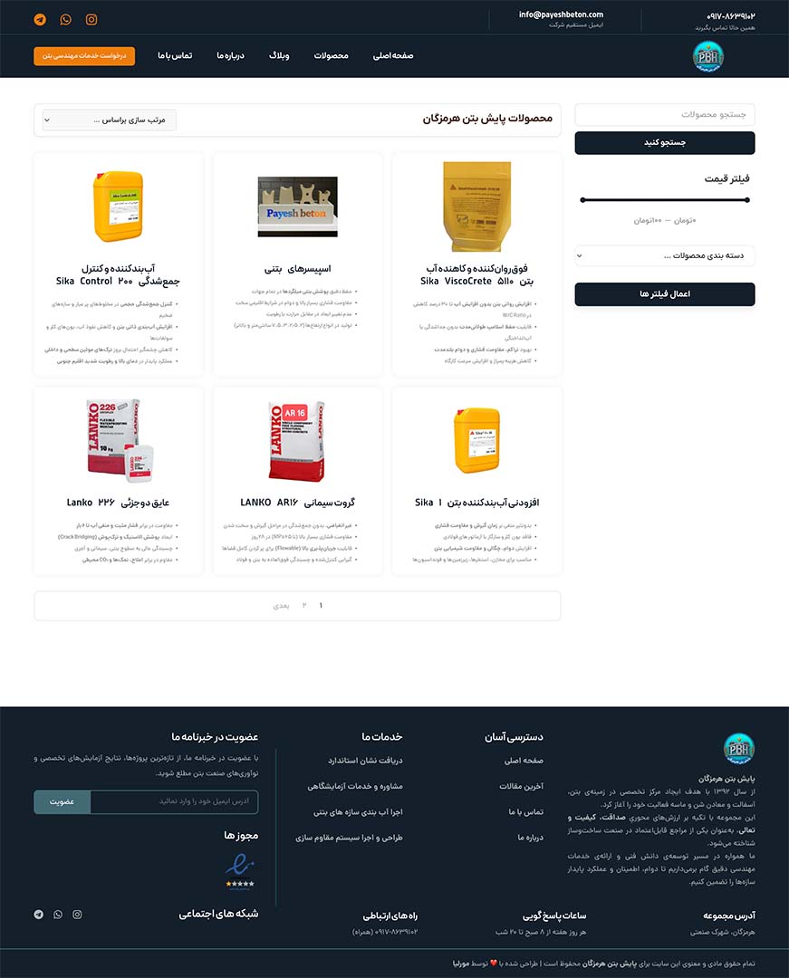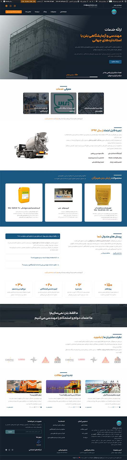 پایش بتن هرمزگان، یکی از پروژههای موفق ما در حوزه طراحی سایت فروشگاهی–شرکتی بود که با هدف بازطراحی کامل وبسایت و خلق تصویری معتبر و سنگین برای برند اجرا شد. این مجموعه که در زمینه خدمات مهندسی، آزمایشگاهی و شیمیایی بتن فعالیت دارد، به دنبال بستری بود که بتواند هویت فنی و صنعتی خود را با زبان دیجیتال و حس لوکس به نمایش بگذارد.